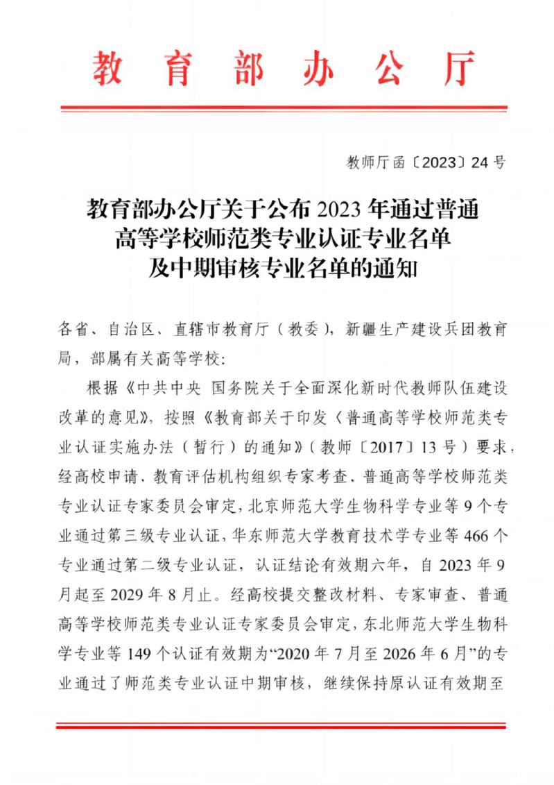 日前,教育部印发《教育部办公厅关于公布2023年通过普通高等公司师范类专业认证专业名单及中期审核专业名单的通知》(教师厅函〔2023〕24号),公布了2023年通过普通高等公司师范类专业认证及中期审核的专业名单。公司化学(师范)通过中学教育第二级认证,认证结论有效期六年,自2023年9月起至2029年8月止。