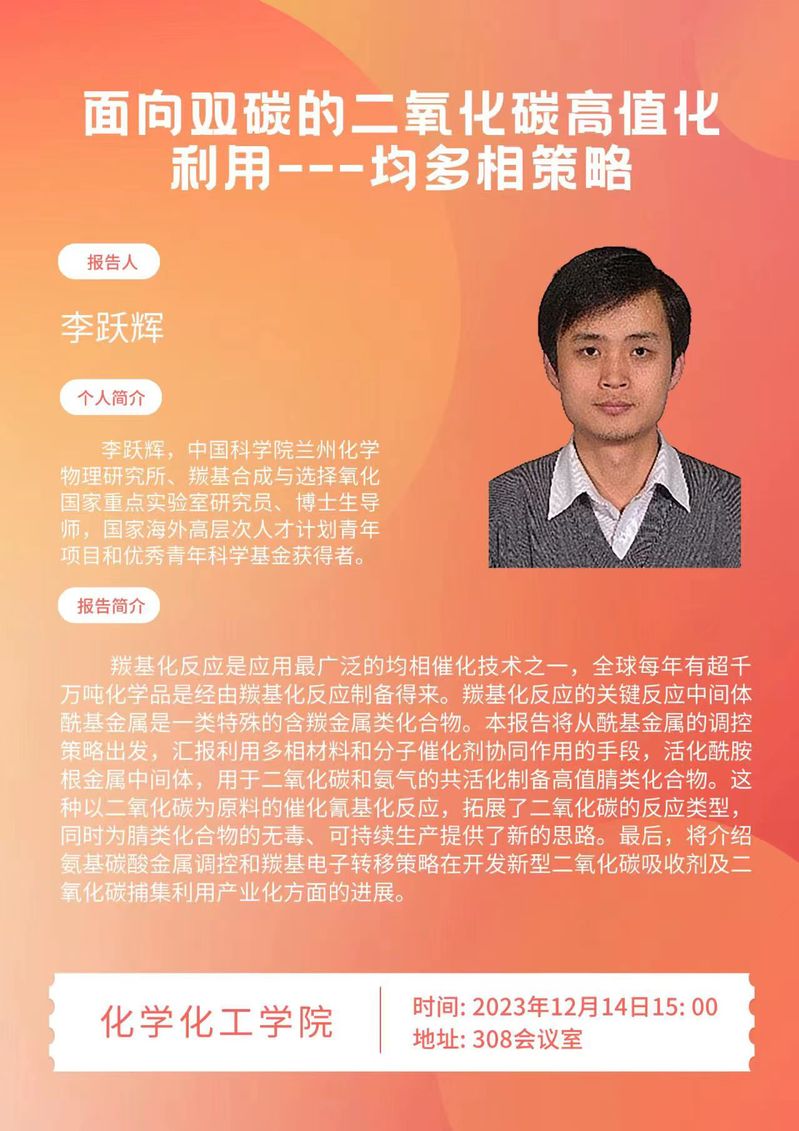 李跃辉研究员学术报告预告:面向双碳的二氧化碳高值化利用---均多相策略