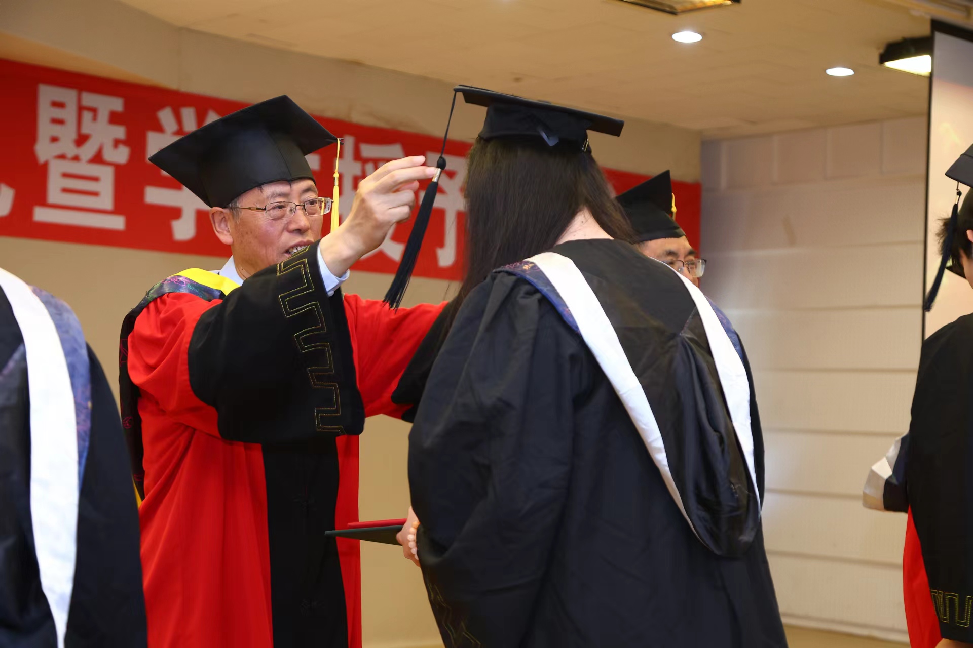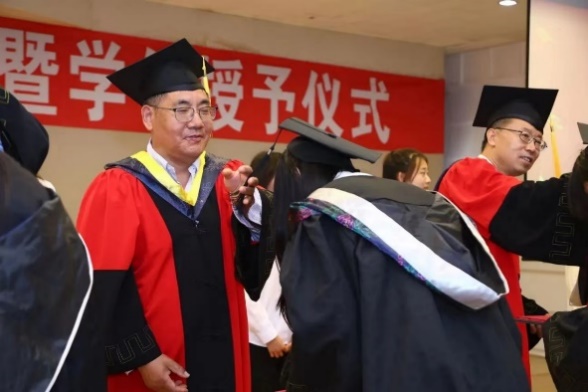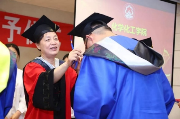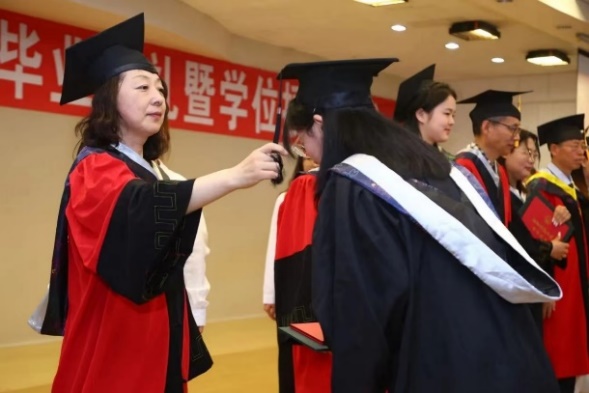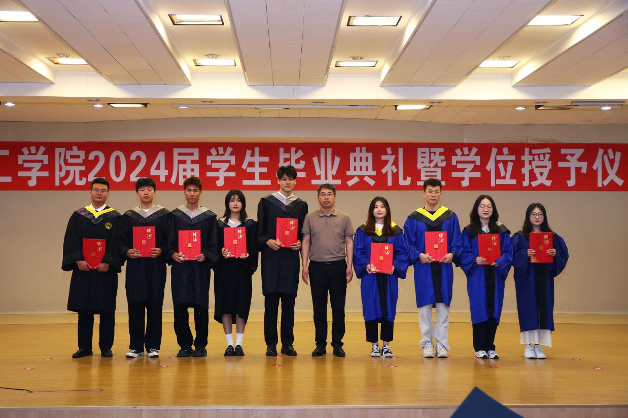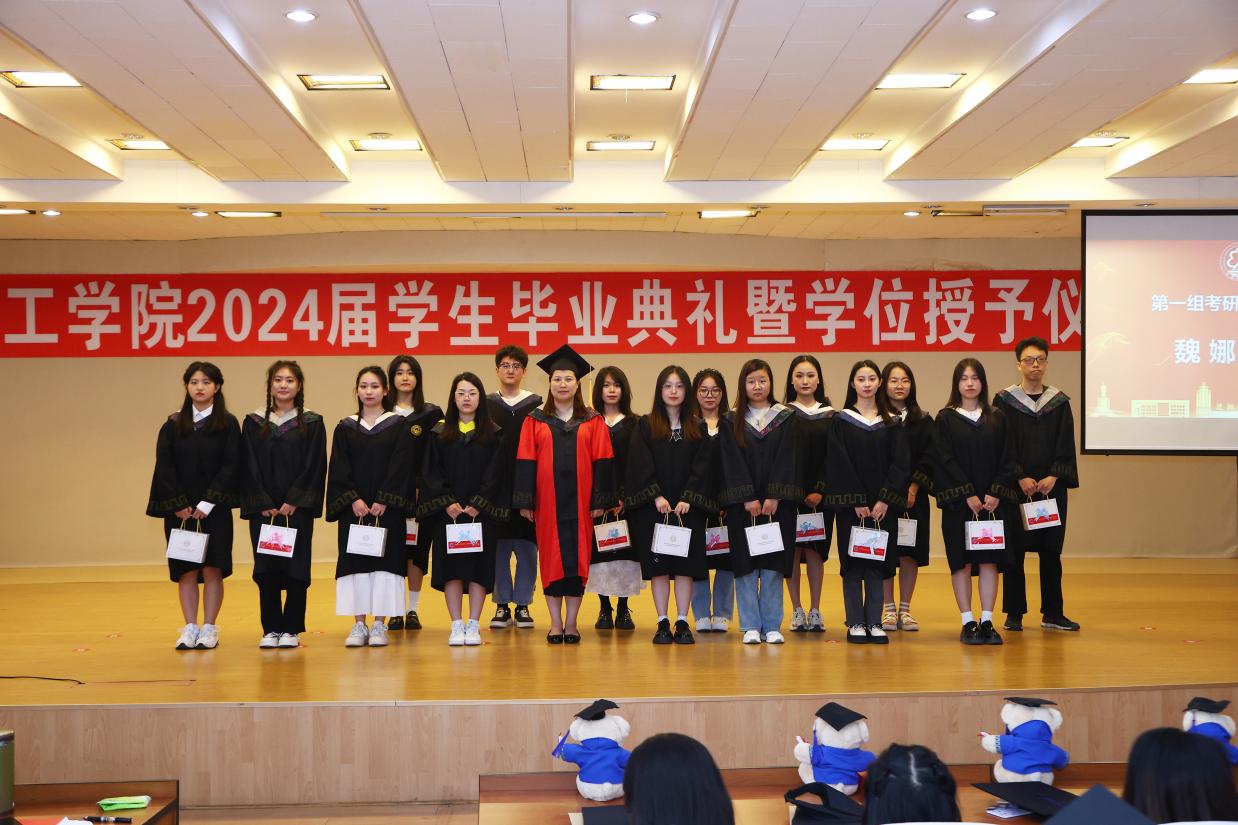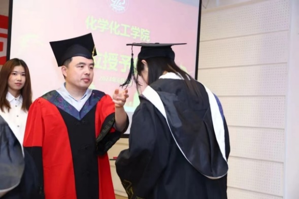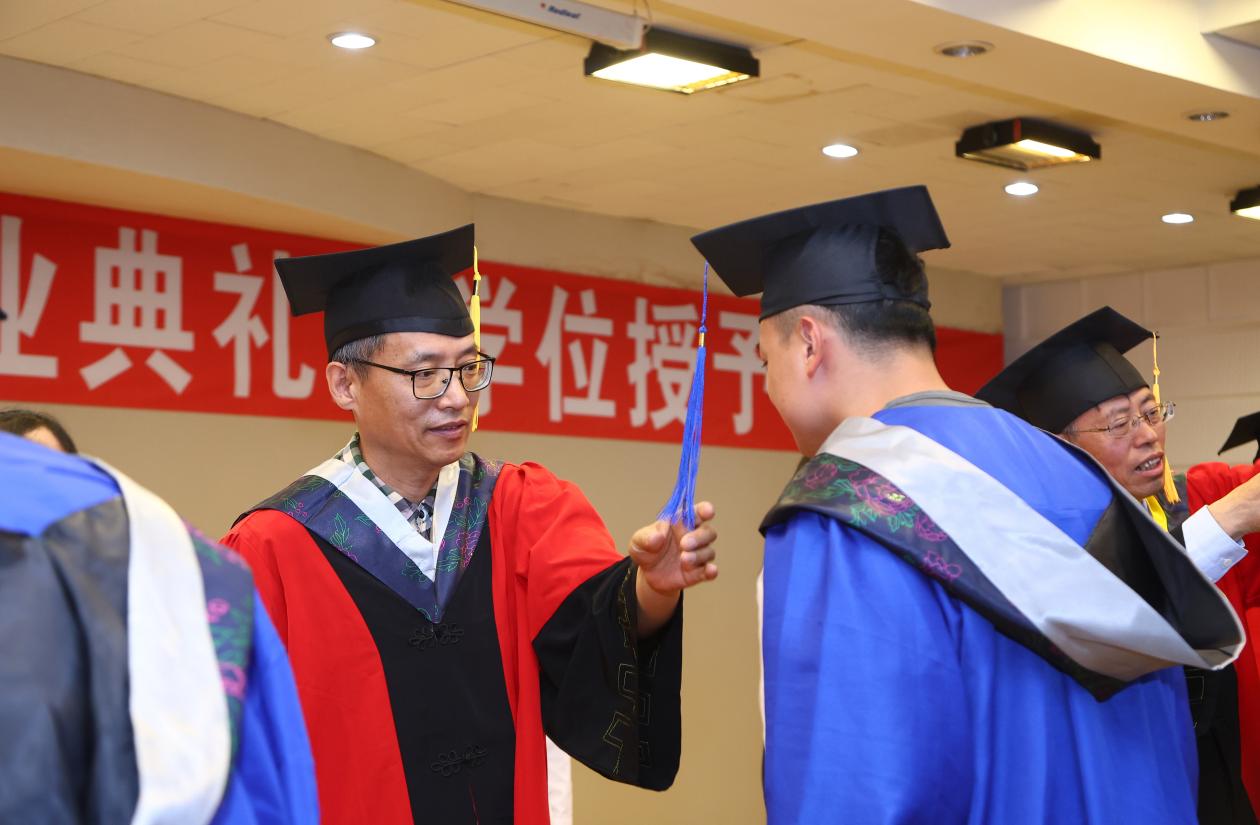 最后,由于湛副经理宣读学位授予决定,至此,学位授予仪式正式开始。赵震教授、杨春才教授、曹中秋教授、刘颖教授、孙秋菊教授、田鹏教授、康艳红教授、李波教授为毕业生移流苏并颁发毕业证书、学位证书,最后合影留念。