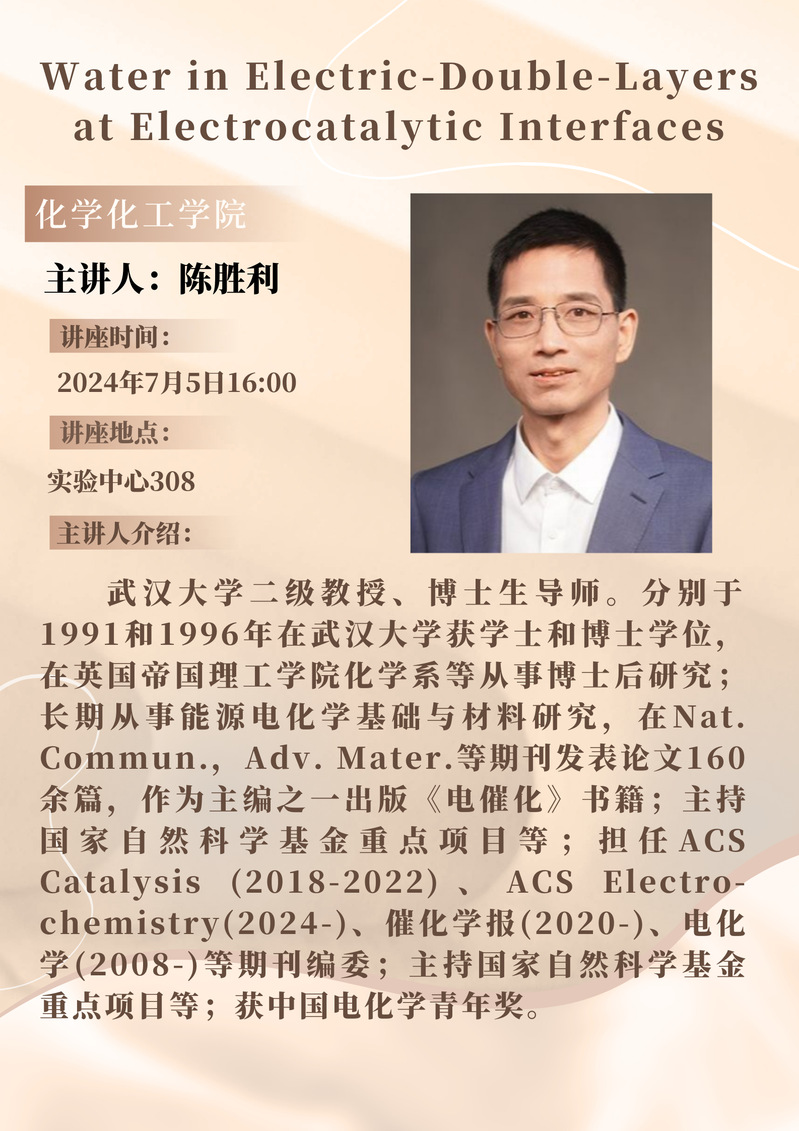 陈胜利教授学术报告预告:Water in Electric-Double-Layers at Electrocatalytic Interfaces