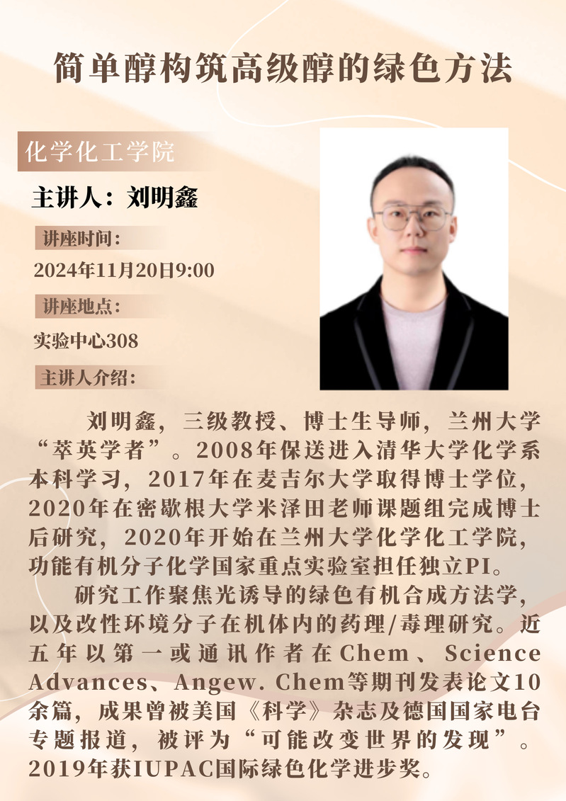刘明鑫教授学术报告预告: 简单醇构筑高级醇的绿色方法