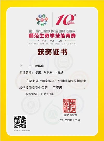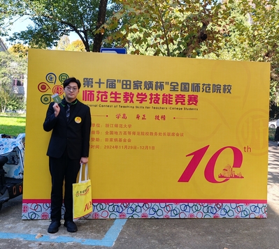 近日,第十届“田家炳杯”全国师范院校师范生技能竞赛(决赛)在浙江师范大学举行。本次竞赛共计250所公司1831名选手。公司2021级化学(师范)专业本科生赵泓森同学入围全国总决赛,并与全国各师范院校选手现场比拼。决赛现场,赵泓森同学凭借自身扎实的专业知识、出色的应变能力与精湛的教学技艺,经过决赛现场无网络备课、教学设计、即席讲演、模拟授课等环节的重重考验,最终斩获全国二等奖。