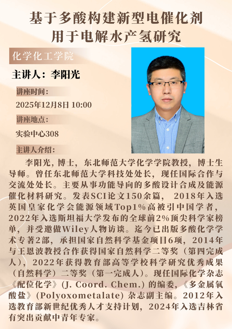 李阳光教授学术报告预告:基于多酸构建新型电催化剂用于电解水产氢研究